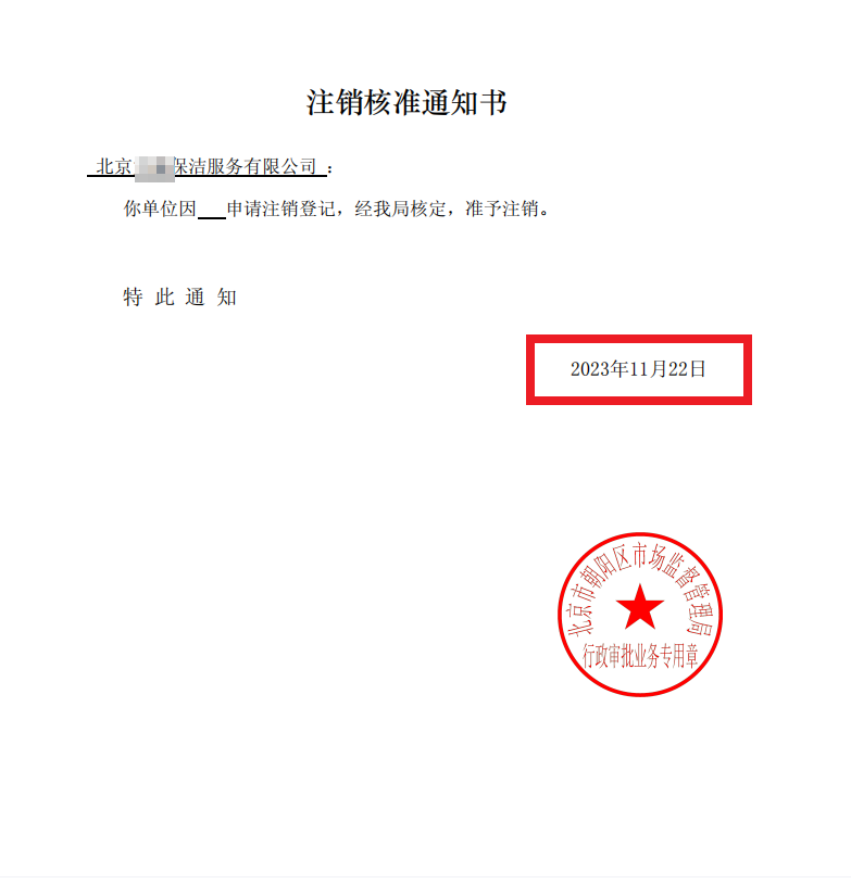 注销核准通知书 北京xxxxx保洁服务有限公司 : 你单位因xxxxxxxx申请注销登记,经我局核定,准予注销。 特 此 通 知 2023年11月22日 为什么要及时注销公司? 高额罚款 企业记录会长期保存在税务局的系统内,后期再创..